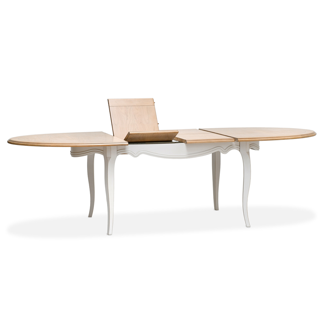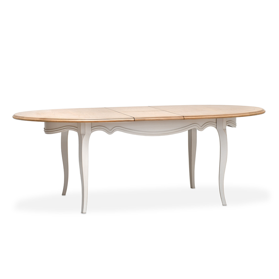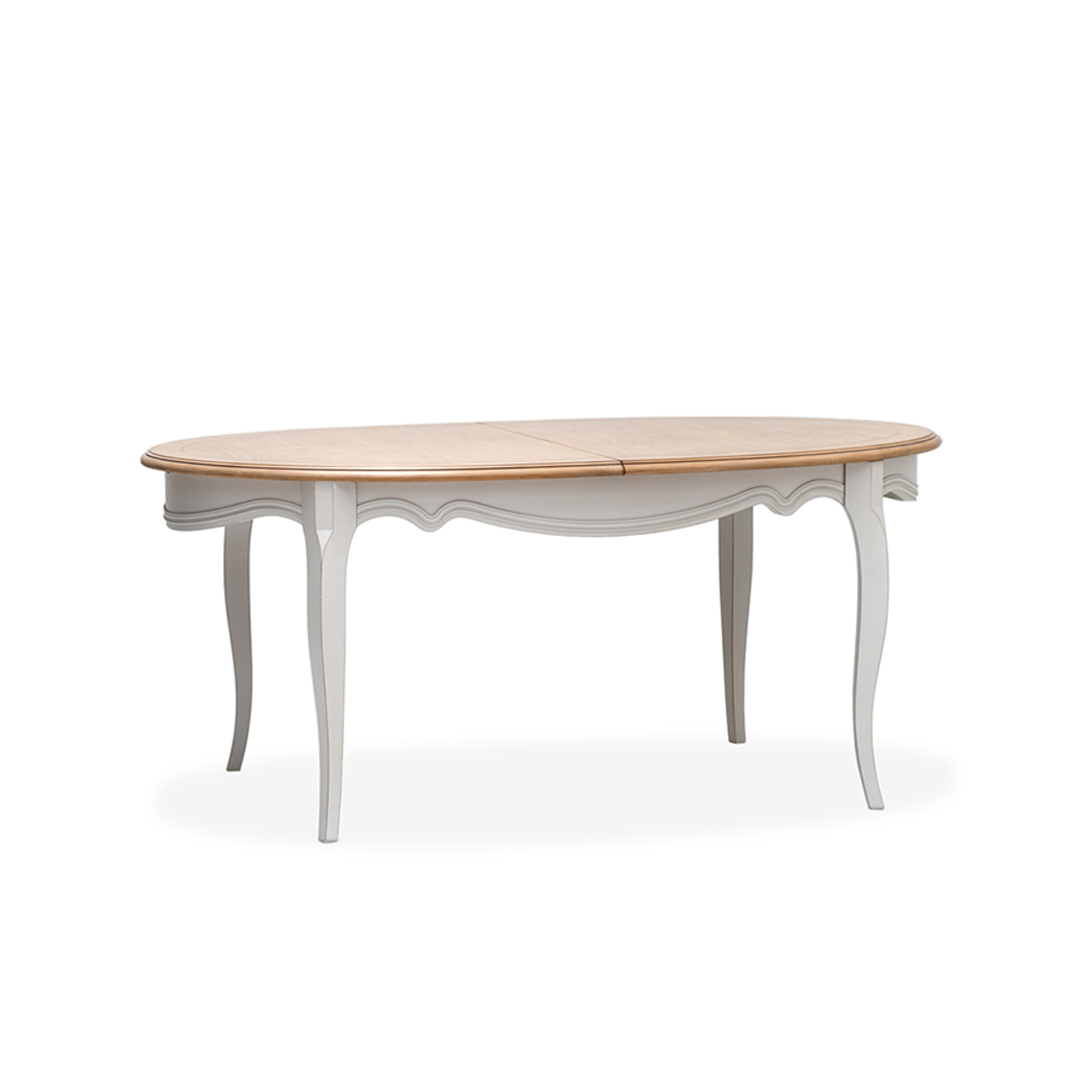 Elegantiškas, klasikinio stiliaus, ovalus, išdidinamasis stalas, pasižymintis subtilia tekstūra bei spalva.