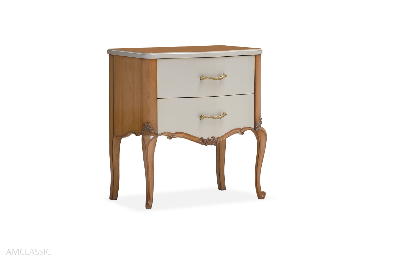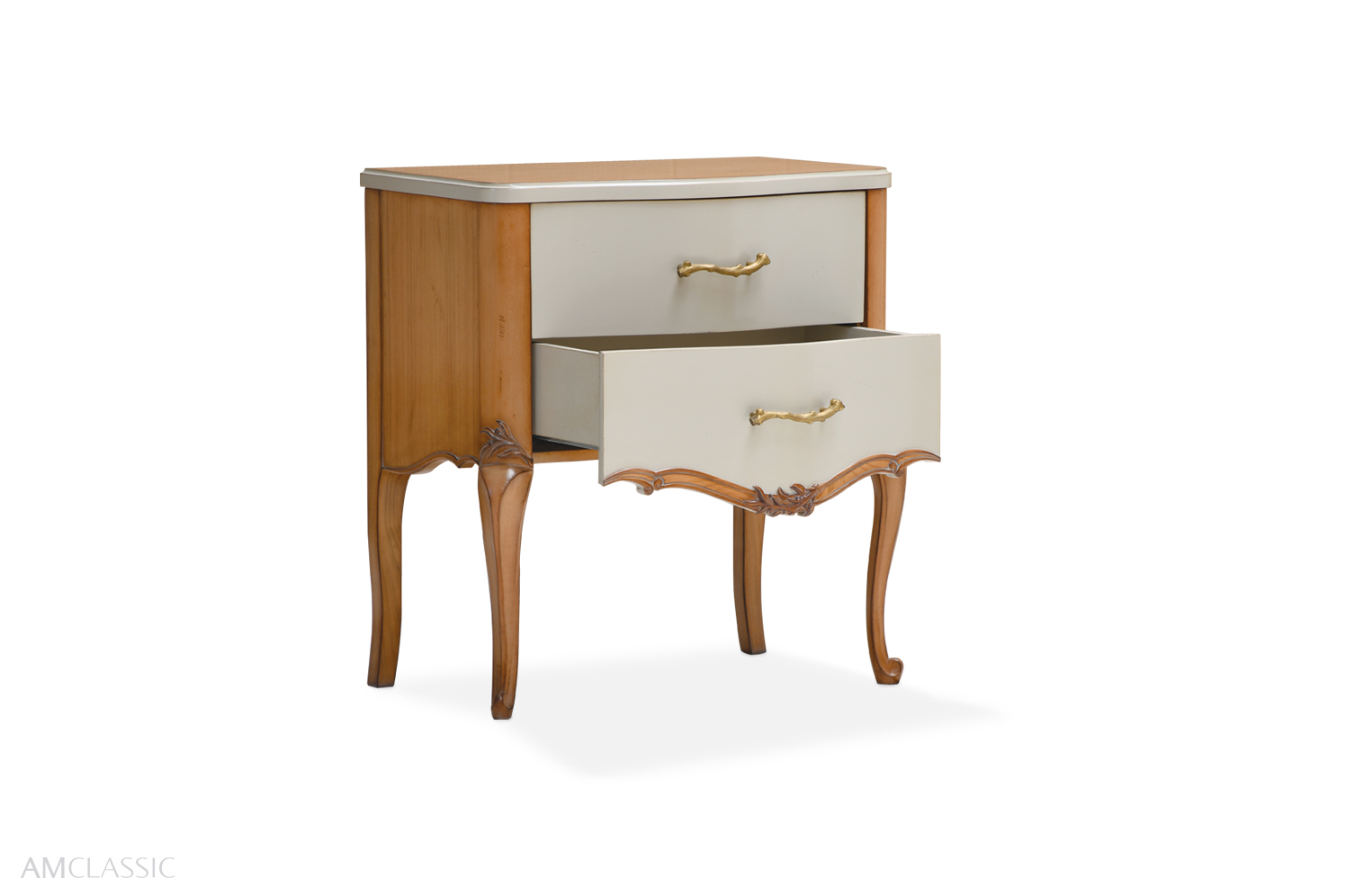 Florence bedside table is gracefully adorned with high-relief carved floral motifs and leaf-shaped handles.
