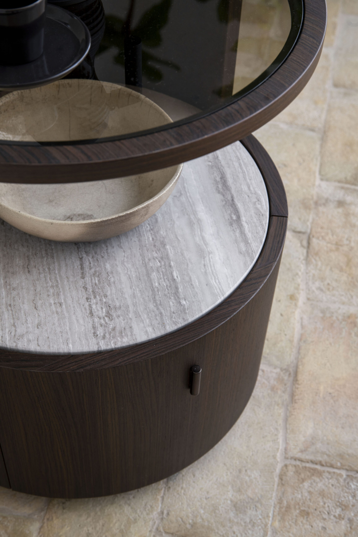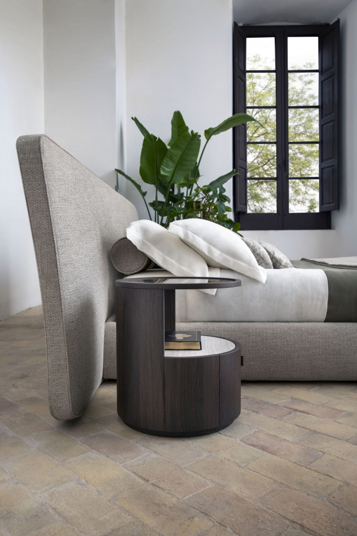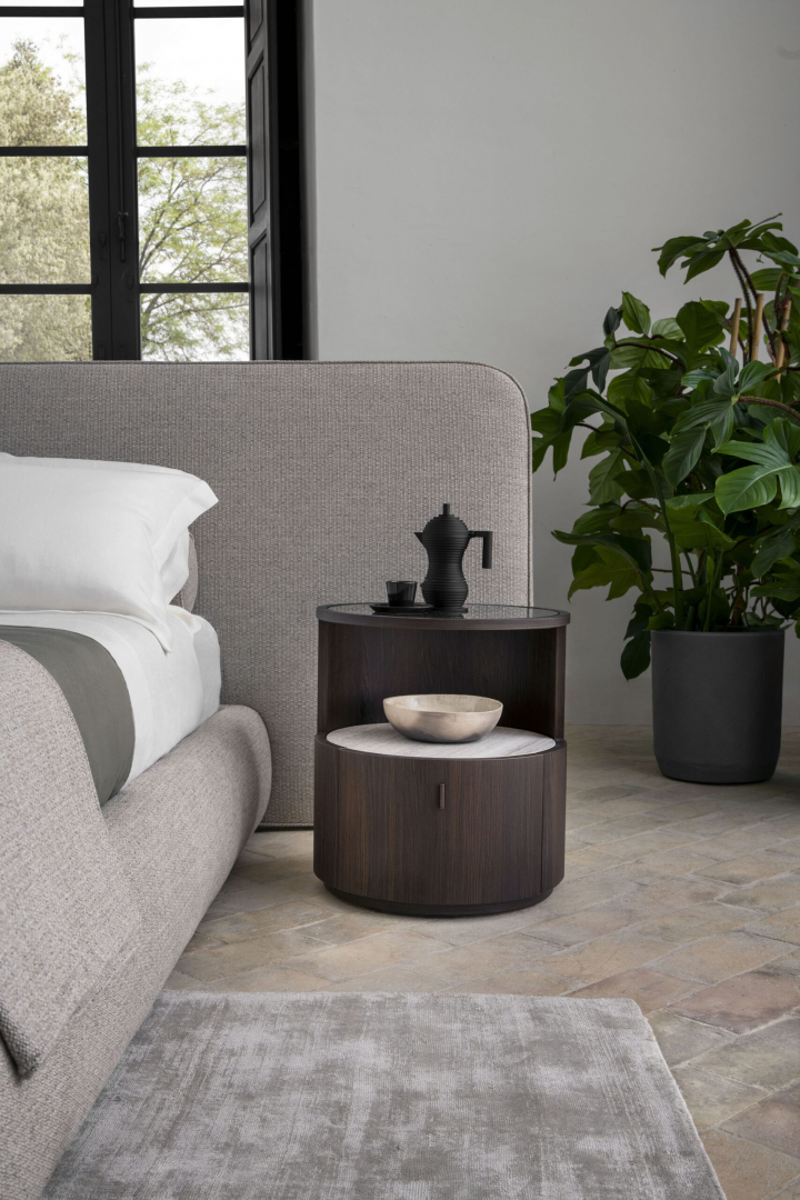 Inspired by New York's rooftop gardens, the Roof bedside table, designed by architect Joe Garzone, features sleek and elegant lines. It consists of a curved solid wood circular structure paired with a suspended glass or marble top, and a curved drawer with a second tier in marble or wood. The handle is available in burnished brass or painted metal.